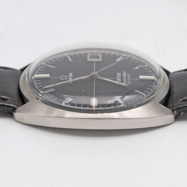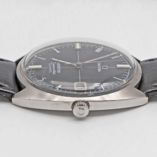 A GENTLEMAN'S STAINLESS STEEL OMEGA SEAMASTER COSMIC WRIST WATCHCIRCA 1960s, ORIGINALLY RETAILED BY MEISTER WITH RARE CO-SIGNED DIALMovement: Manual wind, signed Omega, numbered.Case: Width approx. 35mm, monocoque case, Seamaster emblem on case back, Omega crown.Strap: Omega black leather strap & pin buckle.CONDITION REPORTDial: Original dial in very good condition, small paint loss in the centre from previous removal of hands during service.Movement: Running & functioning at present, timekeeping and accuracy cannot be guaranteed.Case: In good condition, with some light wear due to general use.Strap/Bracelet: In good condition.