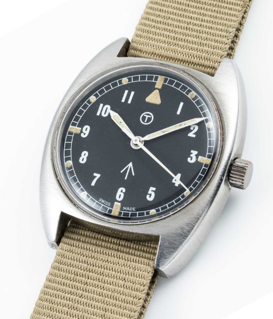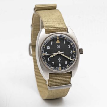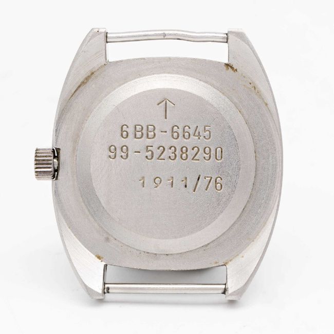 A RARE GENTLEMAN'S STAINLESS STEEL BRITISH MILITARY RAF PILOTS WRIST WATCH DATED 1976, THE "LOST" NAVIGATOR WITH STERILE DIALMovement: Manual wind, hacking seconds, A.Schild cal. 2160.Case: Width approx. 35.5mm, fixed bars, issue markings ^ 6 BB-6645 99-5238290 1911/76.Strap: NATO.  CONDITION REPORTDial: Original dial in excellent condition. Movement: Running & functioning at present, timekeeping and accuracy cannot be guaranteed. Case: In very good condition, with some light scratches due to general use. Strap/Bracelet: In excellent condition.