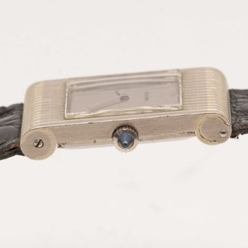 A RARE GENTLEMAN'S 18K SOLID WHITE GOLD BOUCHERON REFLET WRIST WATCHDATED 1966, WITH LONDON IMPORT HALLMARKS & OMEGA MOVEMENT, ACCOMPANIED BY ORIGINAL BOX & BOUCHERON SERVICE PAPERS FROM 1980Movement: 17J, manual wind, cal. 620, signed Omega, numbered.Case: Measures approx. 31.5mm by 21mm, signed Boucheron made in France, numbered 88xx, French 18k hallmark and 18k London import mark with letter L, sapphire crown.Bracelet: Original Boucheron strap. CONDITION REPORTDial: Original dial in very good condition, showing small signs of age. Movement: Running & functioning at present, timekeeping and accuracy cannot be guaranteed.Case: In excellent condition, with some light scratches due to general use.Strap: In very good condition.