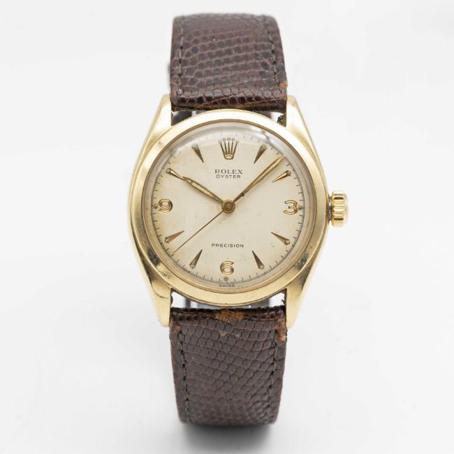 A RARE GENTLEMAN'S 10K SOLID GOLD ROLEX OYSTER PRECISION WRIST WATCHCIRCA 1952, REF. 6022 WITH 3-6-9 DIALMovement: 17J, manual wind, signed Montres Rolex S.A., numbered.Case: Diameter approx. 33mm, signed Rolex, hallmarks, serial no. 84x,xxx (in-between lugs and inside case back), Rolex crown.Strap: Rolex leather strap with unsigned pin buckle.CONDITION REPORTDial: Original dial in very good condition, showing some small signs of age.Movement: Running & functioning at present, timekeeping and accuracy cannot be guaranteed.Case: In good condition, with some small scratches & light wear due to general use.Strap/Bracelet: In fair condition.