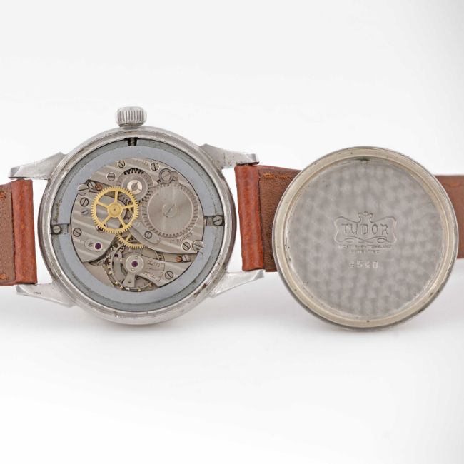 A GENTLEMAN'S SIZE STAINLESS STEEL TUDOR OYSTER WRIST WATCHCIRCA 1950s, REF. 4540Movement: 17J, manual wind.Case: Diameter approx. 34mm, Oyster case, signed Tudor, numbered, Oyster Patent crown.Strap: Leather.CONDITION REPORTDial: Original dial in very good condition, showing some small signs of age.Movement: Running & functioning at present, timekeeping and accuracy cannot be guaranteed.Case: In very good condition, with small scratches mainly to the case back from opening.Strap/Bracelet: In excellent condition.