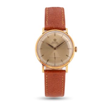 A GENTLEMAN'S 18K SOLID GOLD OMEGA CENTURY WRIST WATCHCIRCA 1964, REF. 121.014Movement: 17J, manual wind, cal. 269,  signed Omega, numbered 21,xxx,xxx.Case: Diameter approx. 34mm, signed Omega, numbered, Swiss 18k hallmarks, Omega crown.Strap: Leather.CONDITION REPORTDial: Original dial in very good condition, showing some small signs of age.Movement: Running & functioning at present, timekeeping and accuracy cannot be guaranteed.Case: In very good condition, with some small scratches due to general use.Strap/Bracelet: In fair condition.