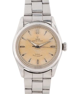A RARE GENTLEMAN'S STAINLESS STEEL TUDOR OYSTER PRINCE SELF WINDING BRACELET WATCHCIRCA 1950s, REF. 7909 "BNGE" THE EXACT MODEL USED DURING THE BRITISH NORTH GREENLAND EXPEDITION DURING 1952-54 Movement: 17J, automatic, "butterfly" rotor, signed Tudor Auto Prince.Case: Diameter approx. 34mm, Oyster case, signed Montres Tudor S.A., serial no. 14x,xxx, Rolex Brevet + crown.Bracelet: Rolex Oyster bracelet, numbered B/7835/19/357.CONDITION REPORTDial: Original dial in good condition, showing some signs of age and patina.Movement: Running & functioning at present, timekeeping and accuracy cannot be guaranteed.Case: In very good condition, with some scratches and wear due to general use.Strap/Bracelet: In very good condition, with light scratches to general use.