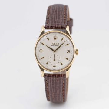 A GENTLEMAN'S SIZE 9CT SOLID GOLD ROLEX PRECISION WRIST WATCHCIRCA 1960s Movement: 17J, manual wind, cal. 1200, signed Montres Rolex S.A., numbered.Case: Diameter approx. 31mm, snap back case, signed Dennison Made For Rolex, hallmarked, numbered.Strap: Leather.CONDITION REPORTDial: Dial in excellent condition, showing small signs of age.Movement: Running & functioning at present, timekeeping and accuracy cannot be guaranteed.Case: In very good condition, with some light scratches & wear due to general use.Strap/Bracelet: In excellent condition.