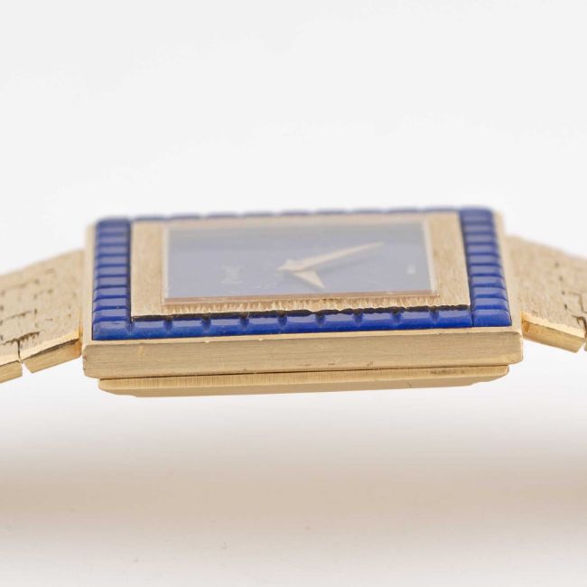 A FINE 18K SOLID GOLD & LAPIS LAZULI PIAGET BRACELET WATCHCIRCA 1970s, REF. 9200 A6 WITH LAPIS LAZULI STONE DIALMovement: 18J, manual wind, cal. 9P, signed Piaget, numbered.Case: Width approx. 25mm, square case held by four screws, factory set with lapis lazuli stones, signed Piaget Swiss, serial no. 17x,xxx, 18k hallmarks.Bracelet: Original Piaget 18k solid gold integral bracelet, hallmarked, total length measures approx. 143mm.CONDITION REPORTDial: Original dial in excellent condition, no cracks.Movement: Running & functioning at present, timekeeping and accuracy cannot be guaranteed.Case: In very good condition, with some light scratches & wear due to general use.Strap/Bracelet: In good condition, with some wear.
