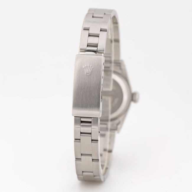 A LADIES STAINLESS STEEL ROLEX OYSTER PERPETUAL BRACELET WATCHCIRCA 1990, REF. 67230 WITH GREY DIALMovement: 29J, automatic, cal. 2130, signed Rolex S.A.Case: Diameter approx. 26mm, Oyster case, signed Montres Rolex S.A., E serial no., milled bezel, sapphire crystal, Rolex crown.Bracelet: Original Rolex Oyster bracelet, numbered O2/78340/566B.CONDITION REPORTDial: Original dial in very good condition.Movement: Running & functioning at present, timekeeping and accuracy cannot be guaranteed.Case: In excellent condition, with some light scratches due to general use.Strap/Bracelet: In very good condition.