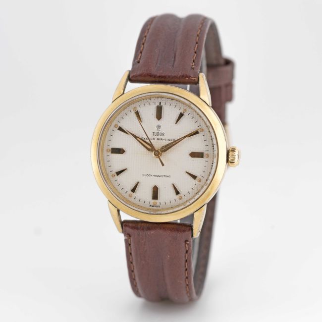 A GENTLEMAN'S STAINLESS STEEL TUDOR OYSTER AIR TIGER WRIST WATCHCIRCA 1958, REF. 7957 WITH "WAFFLE" DIAL Movement: 17J, manual wind, signed Tudor.Case: Diameter approx. 35mm, Oyster case, signed Montres Tudor S.A., Rolex crown.Strap: Leather.  CONDITION REPORTDial: Original dial in very good condition with some small signs of age. Movement: Running & functioning at present, timekeeping and accuracy cannot be guaranteed. Case: In good condition, with some small scratches and wear due to general use. Strap/Bracelet: In good condition.