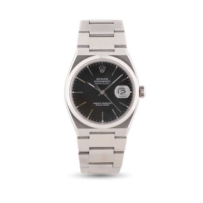 A GENTLEMAN'S SIZE STAINLESS STEEL ROLEX OYSTERQUARTZ DATEJUST BRACELET WATCHCIRCA 1978, REF. 17000 WITH BLACK DIAL, ACCOMPANIED BY ROLEX SERVICE GUARANTEE FROM 2014 AND INDEPENDENT SERVICE PAPERWORK FROM 2019Movement: 11J, quartz chronometer, cal. 5035, signed Montres Rolex S.A., numbered.Case: Diameter approx. 36mm, Oyster case, signed Montres Rolex S.A., serial no. 5,2xx,xxx, smooth bezel, Rolex crown.Bracelet: Original Rolex Oysterquartz bracelet with service clasp, numbered PJ8 S/17.000B.CONDITION REPORTDial: Original dial in very good condition, showing some small signs of age.Movement: Running & functioning at present, timekeeping and accuracy cannot be guaranteed.Case: In excellent condition, with some light scratches due to general use.Strap/Bracelet: In very good condition, with some small scratches & wear.