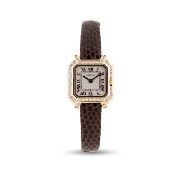 A LADIES 18K SOLID GOLD & DIAMOND CARTIER CEINTURE WRIST WATCHCIRCA 1990sMovement: Quartz, signed Cartier.Case: Width approx. 22.2mm, factory diamond set case, signed Cartier, numbered, 18k hallmarks, original  crown.Strap: Leather.CONDITION REPORTDial: Original dial in very good condition.Movement: Running & functioning at present, timekeeping and accuracy cannot be guaranteed.Case: In excellent condition, with some light scratches due to general use.Strap/Bracelet: In excellent condition.