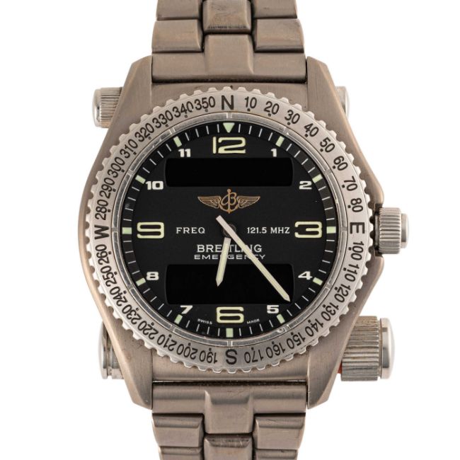 A GENTLEMAN'S SIZE TITANIUM BREITLING EMERGENCY BRACELET WATCHCIRCA 2000, REF. E56121 Movement: Quartz.Case: Diameter approx. 43mm, transmitter device, signed Breitling, numbered, rotating navigational bezel.Bracelet: Original Breitling Emergency titanium bracelet with flip lock clasp & extension.CONDITION REPORTDial: Original dial in excellent condition.Movement: Running & functioning at present, timekeeping and accuracy cannot be guaranteed.Case: In very good condition, with some small scratches due to general use.Strap/Bracelet: In good condition, with light scratches & wear.