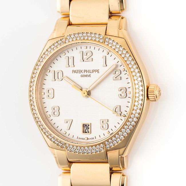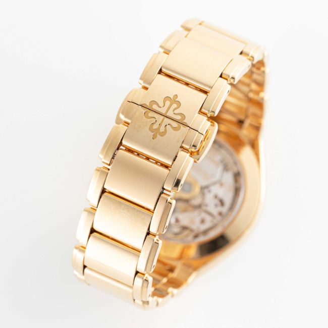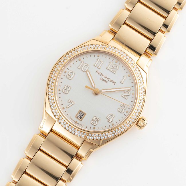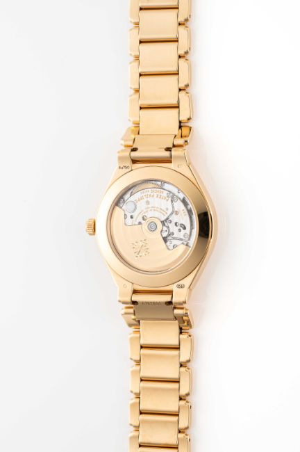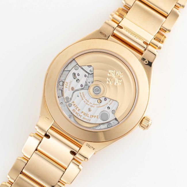 Case: Diameter approx. 36mm, original diamond set bezel, exhibition back, signed Patek Philippe, numbered, 18k hallmarks, original crown.