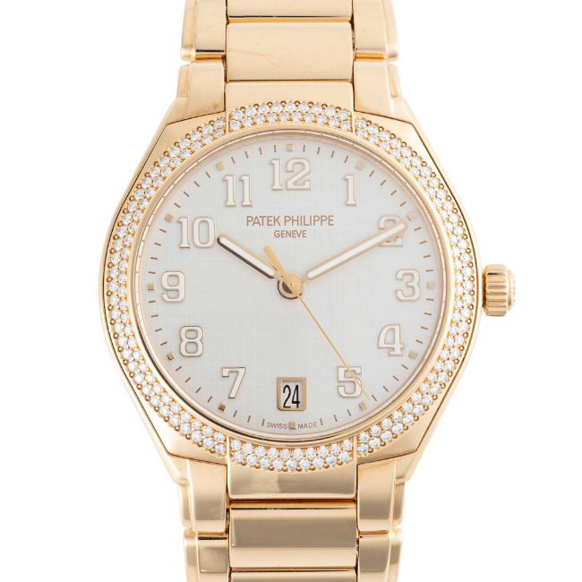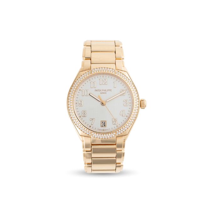 A FINE LADIES 18K SOLID ROSE GOLD & DIAMOND PATEK PHILIPPE TWENTY-4 AUTOMATIC BRACELET WATCH