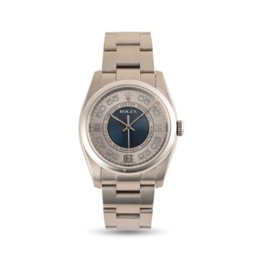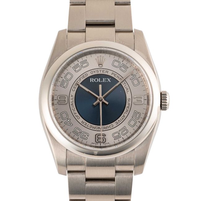 A GENTLEMAN'S SIZE STAINLESS STEEL ROLEX OYSTER PERPETUAL 36 BRACELET WATCHDATED 2008, REF. 116000 WITH BLUE & SILVER CONCENTRIC BULLSEYE DIALMovement: 31J, automatic chronometer, cal. 3130, signed Rolex, numbered.Case: Diameter approx. 36mm, Oyster case, signed Rolex S.A., M serial no., smooth bezel, sapphire crystal, Rolex crown.Bracelet: Original Rolex Oyster bracelet.CONDITION REPORTDial: Original dial in excellent condition.Movement: Running & functioning at present, timekeeping and accuracy cannot be guaranteed.Case: In excellent condition, with some light scratches due to general use.Strap/Bracelet: In excellent condition, with some light scratches.