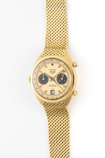 A RARE GENTLEMAN'S SIZE 18K SOLID GOLD HEUER CARRERA AUTOMATIC CHRONOGRAPH BRACELET WATCH CIRCA 1970s, REF. 1158 CHN SECOND EXECUTIONMovement: 17J, automatic, cal. 12, signed Heuer.Case: Diameter approx. 38mm, screw back, signed Heuer-Leonidas SA, 18k hallmarks, serial no. 340,xxx, Heuer crown & pushers.Bracelet: Original Heuer Gay Freres 18k solid gold bracelet, dated 1.65.  CONDITION REPORTDial: Original dial in excellent condition. Movement: Running & functioning at present, timekeeping and accuracy cannot be guaranteed. Case: In excellent condition, with light scratches & wear due to general use. Strap/Bracelet: In fair condition, top of clasp has been polished so the Heuer logo is no longer visible.