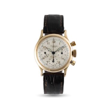 A GENTLEMAN'S SIZE 14K SOLID GOLD UNIVERSAL GENEVE COMPAX "WATERPROOF" CHRONOGRAPH WRIST WATCHCIRCA 1950Movement: 17J, manual wind, cal. 281, signed Universal Geneve, dust cover.Case: Diameter approx. 33.5mm, screw back, signed Universal Geneve, 14k hallmarks.Strap: Leather.  CONDITION REPORTDial: Original dial in very good condition, showing some small signs of age. Movement: Running & functioning at present, timekeeping and accuracy cannot be guaranteed. Case: In good condition, with light scratches & wear due to general use, case back has been polished.  Strap/Bracelet: In good condition.
