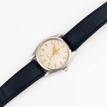 A GENTLEMAN'S SIZE STAINLESS STEEL ROLEX OYSTER PERPETUAL AIR KING PRECISION BRACELET WATCHCIRCA 1963, REF. 5500   Movement: 26J, automatic, cal. 1530, signed Rolex Geneva, numbered. Case: Diameter approx. 34mm, Oyster case, signed Montres Rolex S.A., dated IV.62, serial no. 84x,xxx, case back inscription "British Hydrocarbon Chemicals Limited", Rolex crown. Bracelet: Leather.  CONDITION REPORTDial: Original dial in good condition, showing some signs of age. Movement: Running & functioning at present, timekeeping and accuracy cannot be guaranteed. Case: In good condition, with some light scratches & wear due to general use. Strap/Bracelet: In poor condition.
