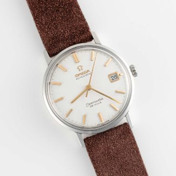 A GENTLEMAN'S SIZE STAINLESS STEEL OMEGA SEAMASTER DE VILLE AUTOMATIC DATE WRIST WATCHCIRCA 1960s, WITH "LINEN" TEXTURED DIALMovement: Automatic, signed Omega Watch Co, numbered.Case: Diameter approx. 34.5mm, two-piece case, Seamaster emblem embossed, signed Omega Watch Co, Omega crown.Strap: Suede leather.CONDITION REPORTDial: Original dial in excellent condition, showing some small signs of age.Movement: Running & functioning at present, timekeeping and accuracy cannot be guaranteed.Case: In excellent condition, with light scratches due to general use.Strap/Bracelet: In excellent condition.