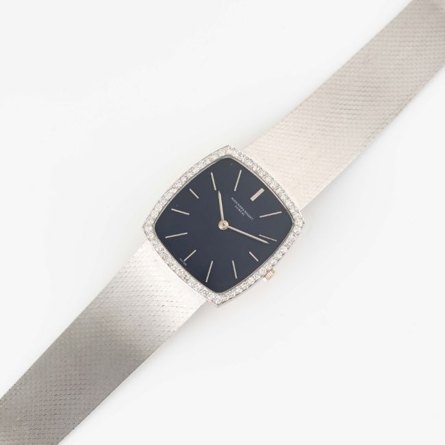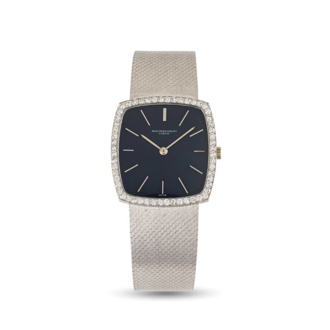 A FINE GENTLEMAN'S SIZE 18K SOLID WHITE GOLD & DIAMOND AUDEMARS PIGUET BRACELET WATCH DATED 1969, WITH ORIGINAL GUARANTEE CERTIFICATE Movement: 17J, manual wind, cal. 2003, signed Audemars Piguet, numbered.Case: Measures approx. 27.84mm by 29.7mm, factory set diamond case, signed Audemars Piguet, 18k hallmarks.Bracelet: Original 18k solid gold integral bracelet, total length is approx. 165mm.    CONDITION REPORTDial: Original dial in excellent condition. Movement: Running & functioning at present, timekeeping and accuracy cannot be guaranteed. Case: In excellent condition, with some light scratches due to general use. Strap/Bracelet: In excellent condition.