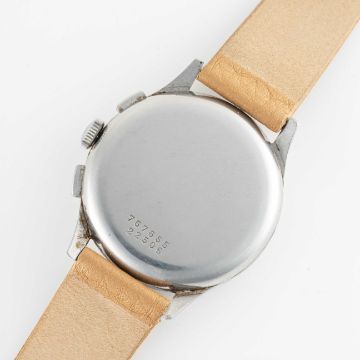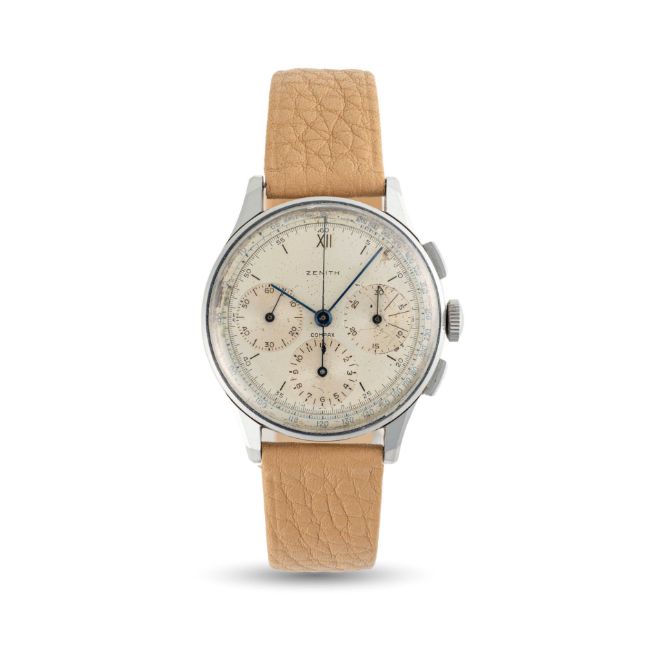 A GENTLEMAN'S LARGE SIZE STAINLESS STEEL ZENITH COMPAX CHRONOGRAPH WRIST WATCHCIRCA 1950, REF. 22506 WITH CAL. 156 H MOVEMENT Movement: Manual wind, Martel base cal. 156, signed Zenith.Case: Diameter approx. 37mm, faceted lugs, snap back, signed Zenith, numbered.Strap: Leather.CONDITION REPORTDial: Original dial in fair condition, showing signs of age.Movement: Running & functioning at present, timekeeping and accuracy cannot be guaranteed.Case: In excellent condition, with some light scratches and wear due to general use.Strap/Bracelet: In excellent condition.
