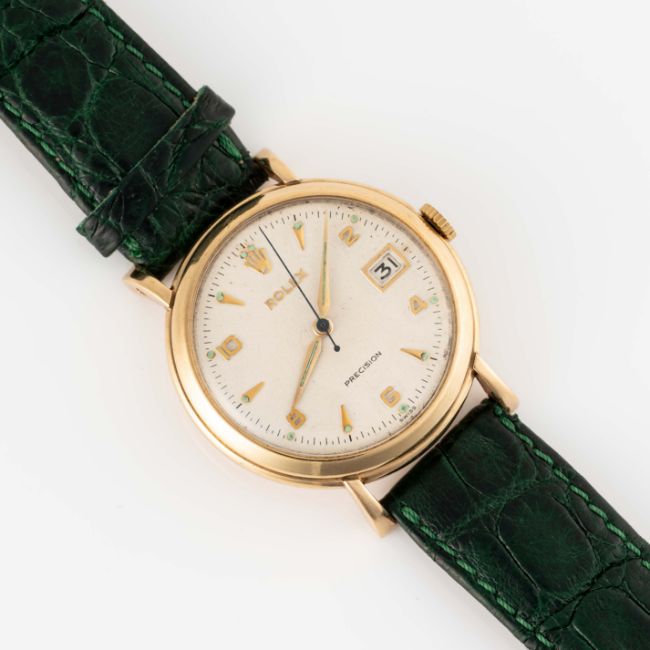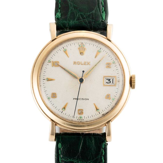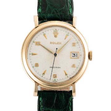 A RARE GENTLEMAN'S SIZE 9CT SOLID GOLD ROLEX PRECISION DATE WRIST WATCHCIRCA 1960s Movement: 17J, manual wind, cal.1210, signed Montres Rolex S.A, numbered. Case: Diameter approx. 34mm, snap back case, signed by Rolex case makers DS&S, hallmarked, numbered. Strap: Leather.   CONDITION REPORTDial: Original dial in good condition, showing signs of age. Movement: Running & functioning at present, timekeeping and accuracy cannot be guaranteed. Case: In very good condition, with light scratches due to general use. Strap/Bracelet: In fair condition.