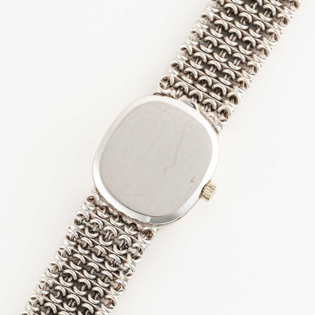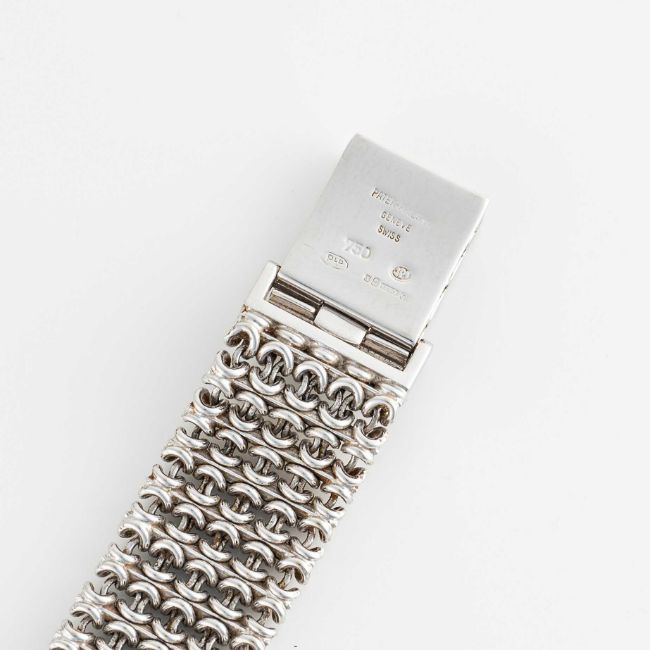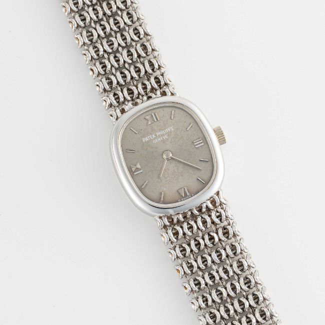 A LADIES 18K SOLID WHITE GOLD PATEK PHILIPPE ELLIPSE BRACELET WATCHCIRCA 1970s, REF. 4201/1Movement: Manual wind, signed Patek Philippe, numbered.Case: Approx. 20mm by 22.5mm, signed Patek Philippe, numbered, 18k hallmarks, original crown.Bracelet: Original Patel Philippe 18k solid white gold integral bracelet, total length measures approx. 170mm.CONDITION REPORTDial: Original dial in fair condition, showing some signs of age.Movement: Running & functioning at present, timekeeping and accuracy cannot be guaranteed.Case: In very good condition, with light scratches due to general use.Strap/Bracelet: In excellent condition.