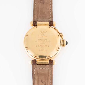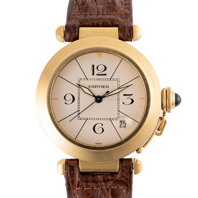 A GENTLEMAN'S SIZE 18K SOLID YELLOW GOLD CARTIER PASHA AUTOMATIC WRIST WATCHCIRCA 1990s, REF. 1990Movement: Automatic, signed Cartier.Case: Diameter approx. 38mm, signed Pasha de Cartier, 18k hallmarks, numbered, original sapphire crown guard. Bracelet: Cartier leather strap and 18k solid yellow pin buckle.  CONDITION REPORTDial: Original dial in excellent condition. Movement: Running & functioning at present, timekeeping and accuracy cannot be guaranteed. Case: In excellent condition, with light scratches due to general use. Strap/Bracelet: In good condition.