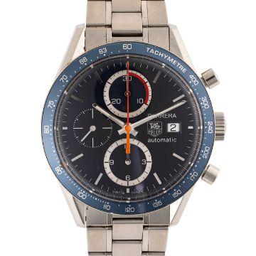 A GENTLEMAN'S SIZE STAINLESS STEEL TAG HEUER CARRERA AUTOMATIC CHRONOGRAPH BRACELET WATCH DATED 2010, REF. CV2015 WITH BLUE DIAL, ACCOMPANIED BY ITS ORIGINAL BOX & PAPERWORKMovement: Automatic, cal. 16, signed TAG Heuer.Case: Diameter approx. 41mm, exhibition back, signed, numbered, blue tachymetre bezel, original crown & pushers.Bracelet: Original TAG Heuer Carrera bracelet.  CONDITION REPORTDial: Original dial in excellent condition. Movement: Running & functioning at present, timekeeping and accuracy cannot be guaranteed. Case: In very good condition, with some small scratches due to general use. Strap/Bracelet: In very good condition, with light scratches.