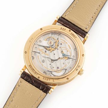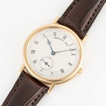 A GENTLEMAN'S SIZE 18K SOLID GOLD BREGUET CLASSIQUE WRIST WATCHCIRCA 2000s, REF. 5907BA/12/984 WITH POWER RESERVE INDICATOR DISPLAYED THROUGH THE EXHIBITION CASE BACK ON THE MOVEMENT, ACCOMPANIED BY ITS ORIGINAL BOXMovement: 24J, manual wind, cal. 510 DR, signed Breguet, numbered.Case: Diameter approx. 34.6mm, classic Breguet coin-edged case, exhibition back, signed Breguet, numbered, 18k hallmarks, original crown.Strap: Leather strap with original Breguet 18k solid gold pin buckle.CONDITION REPORTDial: Original dial in excellent condition.Movement: Running & functioning at present, timekeeping and accuracy cannot be guaranteed.Case: In excellent condition, with some light scratches due to general use.Strap/Bracelet: In excellent condition.