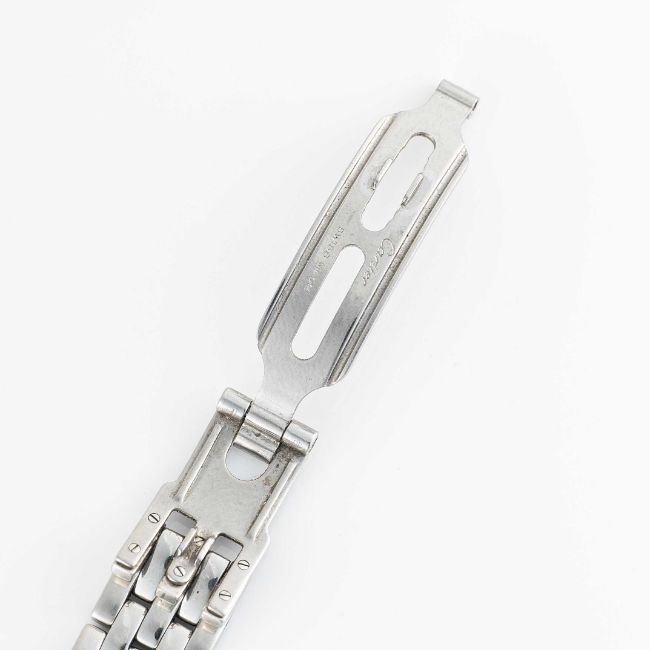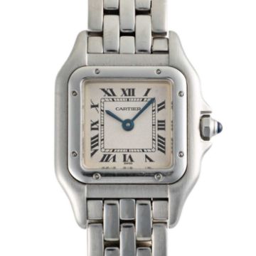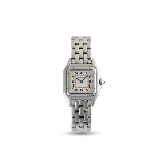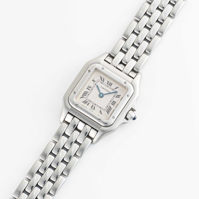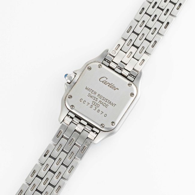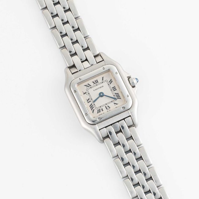 A LADIES STAINLESS STEEL CARTIER PANTHERE BRACELET WATCHCIRCA 1990s, REF. 1320 WITH CARTIER BOX & SERVICE PAPERWORK FROM 2015Movement: Quartz, signed Cartier.Case: Width approx. 22mm, signed Cartier, numbered, sapphire crown.Bracelet: Original Cartier Panthere stainless steel bracelet.CONDITION REPORTDial: Original dial in very good condition.Movement: Running & functioning at present, timekeeping and accuracy cannot be guaranteed.Case: In very good condition, with some light scratches due to general use.Strap/Bracelet: In very good condition, with light scratches.