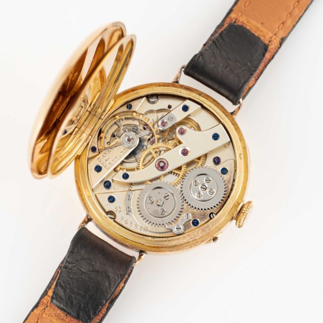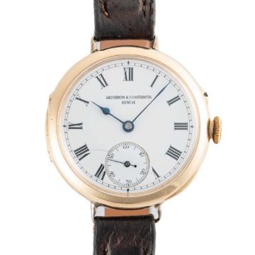A GENTLEMAN'S SIZE 18K SOLID GOLD VACHERON & CONSTANTIN "OFFICERS" WRIST WATCHCIRCA 1915 WITH PORCELAIN DIALMovement: Manual wind, signed Vacheron Constantin and marked with Maltese Cross, numbered.Case: Diameter approx. 34mm, inner cuvette marked "Examined by Goldsmiths & Silversmiths Company Ltd, 112, Regent Street, London", hinged case, marked V&C and with Maltese Cross , 18k hallmarks, numbered.Strap: Leather.CONDITION REPORTDial: Original dial in good condition, hairline crack at 8 o'clock.Movement: Running & functioning at present, timekeeping and accuracy cannot be guaranteed.Case: In good condition, with some scratches and wear due to general use.Strap/Bracelet: In good condition.