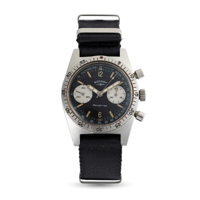 A GENTLEMAN'S SIZE STAINLESS STEEL ROTARY AQUAPLUNGE CHRONOGRAPH WRIST WATCH CIRCA 1970, REF. 7651Movement: Manual wind, Landeron cal. 149.Case: Diameter approx. 37.5mm, screw back, numbered.Strap: NATO.  CONDITION REPORTDial: Original dial in very good condition, showing some small signs of age. Movement: Running & functioning at present, timekeeping and accuracy cannot be guaranteed. Case: In very good condition, with some small scratches due to general use. Strap/Bracelet: In excellent condition.