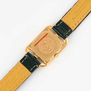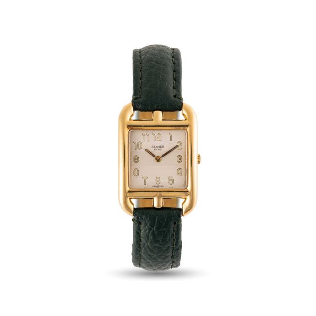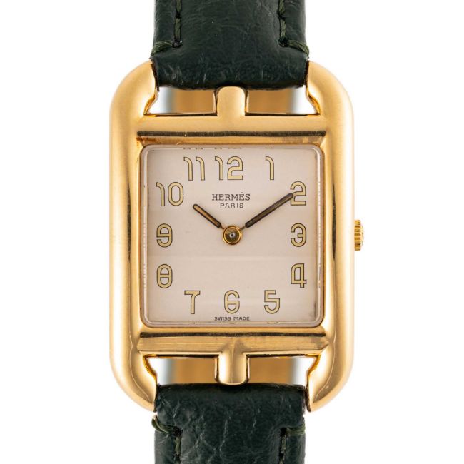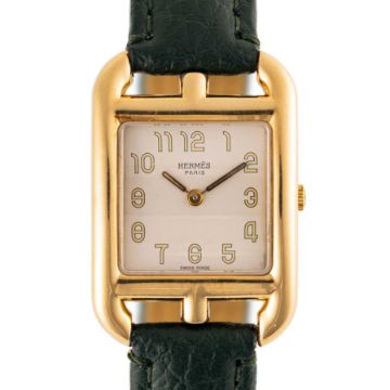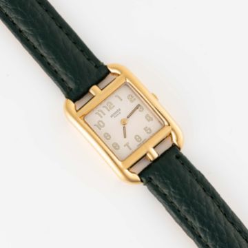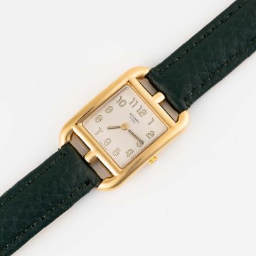 A LADIES 18K SOLID GOLD HERMES CAPE COD WRIST WATCH CIRCA 2010 Movement: Quartz.Case: Approx. 23mm by 33mm, embossed with Hermes logo, 18k hallmarks, numbered, original crown.Strap: Leather, unsigned.  CONDITION REPORTDial: Original dial in very good condition, showing some small signs of age. Movement: Running & functioning at present, timekeeping and accuracy cannot be guaranteed. Case: In very good condition, with some small scratches due to general use. Strap/Bracelet: In excellent condition.