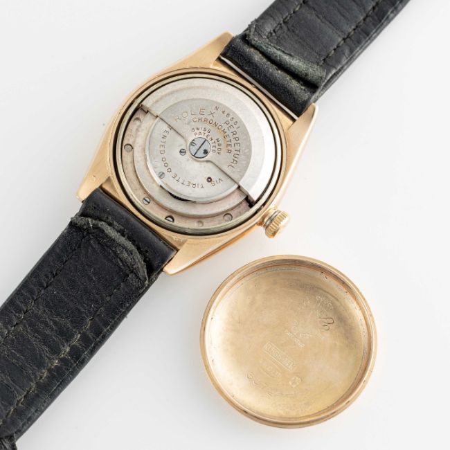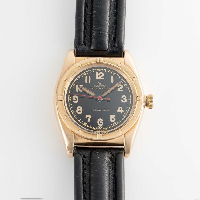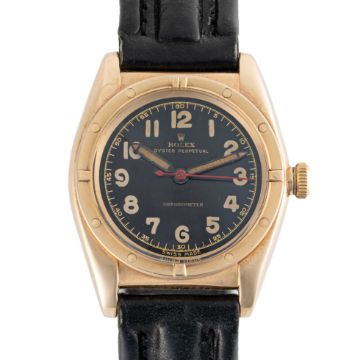 A GENTLEMAN'S SIZE 14K SOLID GOLD ROLEX OYSTER PERPETUAL "BUBBLE BACK" CHRONOMETER WRIST WATCHCIRCA 1946, REF. 3372Movement: Automatic chronometer, signed Rolex, numbered.Case: Diameter approx. 32mm, three piece Oyster, signed Rolex, 14k hallmarks, serial no. 44x,xxx, 'Rolex Oyster' crown.Strap: Leather.CONDITION REPORTDial: Dial in excellent condition, showing some small signs of age.Movement: Running & functioning at present, timekeeping and accuracy cannot be guaranteed.Case: In very good condition, with some light wear & small scratches due to general use.Strap/Bracelet: In poor condition.