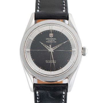 A GENTLEMAN'S SIZE STAINLESS STEEL UNIVERSAL GENEVE POLEROUTER WRIST WATCHCIRCA 1960 WITH BLACK DIALMovement:  28J, automatic microtor, signed Universal Geneve.Case: Diameter approx. 35mm, screw back, signed Universal Geneve Polerouter, Universal Geneve crown.Strap: Leather.  CONDITION REPORTDial: Original dial in good condition, showing some signs of age, hands showing signs of age. Movement: Running & functioning at present, timekeeping and accuracy cannot be guaranteed. Case: In good condition, with some small scratches due to general use, wear to the case back. Strap/Bracelet: In very good condition.