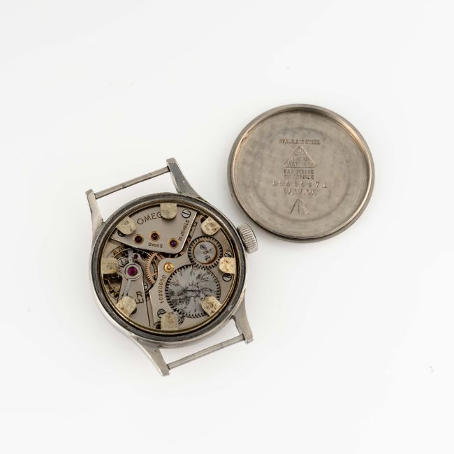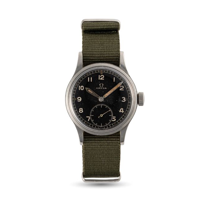 A GENTLEMAN'S STAINLESS STEEL BRITISH MILITARY OMEGA W.W.W. WRIST WATCH CIRCA 1945, PART OF THE "DIRTY DOZEN"  Movement: 15J, manual wind, cal. 30T2, signed Omega, numbered 10,xxx,xxx.Case: Diameter approx. 35mm, fixed bars, screw back, signed Omega Watch Co, issue markings W.W.W. ^ Y 22072 10686271.Strap: NATO.  CONDITION REPORTDial: Original dial in very good condition, showing some signs of age. Movement: Running & functioning at present, timekeeping and accuracy cannot be guaranteed. Case: In very good condition, with some small scratches due to use. Strap/Bracelet: In excellent condition.