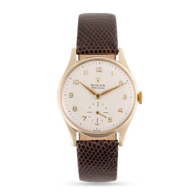 A GENTLEMAN'S SIZE 9CT SOLID GOLD ROLEX PRECISION WRIST WATCHCIRCA 1960s Movement: 17J, manual wind, signed Montres Rolex S.A., numbered. Case: Diameter approx. 31mm, signed Dennison Made in England For Rolex, 9ct hallmarks, numbered. Strap: Leather. CONDITION REPORTDial: Refinished dial in very good condition.Movement: Running & functioning at present, timekeeping and accuracy cannot be guaranteed.Case: In excellent condition.Strap/Bracelet: In excellent condition.