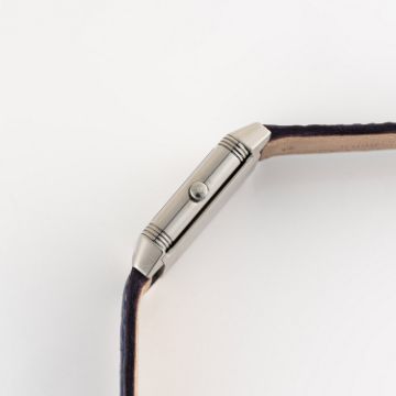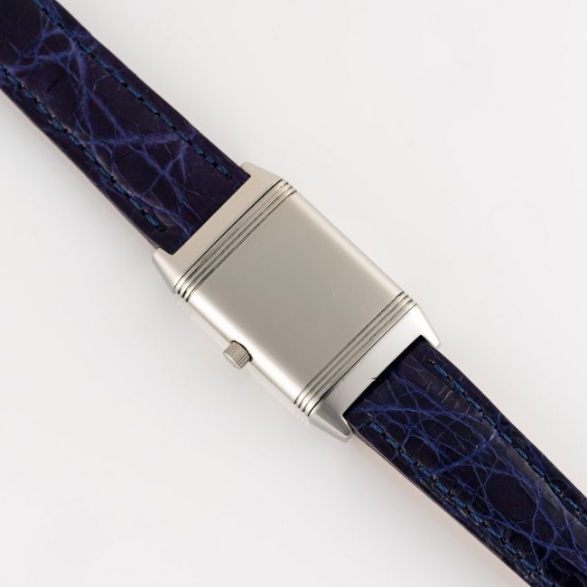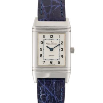 A LADIES STAINLESS STEEL JAEGER LECOULTRE REVERSO WRIST WATCHCIRCA 1990s, REF. 260.8.08 WITH JAEGER-LECOULTRE BOXMovement: Quartz, signed Jaeger-LeCoultre.Case: Approx. 33mm by 19.5mm, plain reverse side, signed Jaeger-LeCoultre Reverso, numbered, JLC crown.Strap: Leather. CONDITION REPORTDial: Original dial in excellent condition.Movement: Running & functioning at present, timekeeping and accuracy cannot be guaranteed.Case: In very good condition, some light scratches due to general use. Strap: In excellent condition.