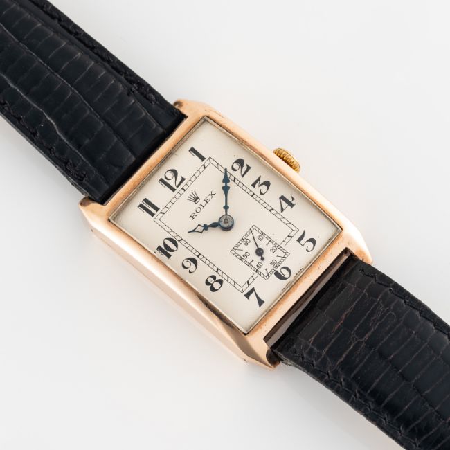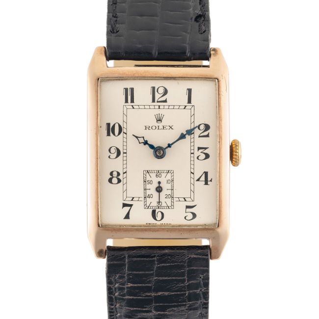 A GENTLEMAN'S SIZE 9CT SOLID GOLD ROLEX RECTANGULAR WRIST WATCHCIRCA 1930, REF. 556 Movement: 15J, manual wind, signed Rolex Prima.Case: Approx. 37.3mm by 25mm including the lugs, signed R.W.C Ltd, 9ct hallmarks, numbered. Strap: Leather.  CONDITION REPORTDial: Refinished dial in very good condition. Movement: Running & functioning at present, timekeeping and accuracy cannot be guaranteed. Case: In very good condition, with some light scratches and wear due to general use. Strap/Bracelet: In good condition.