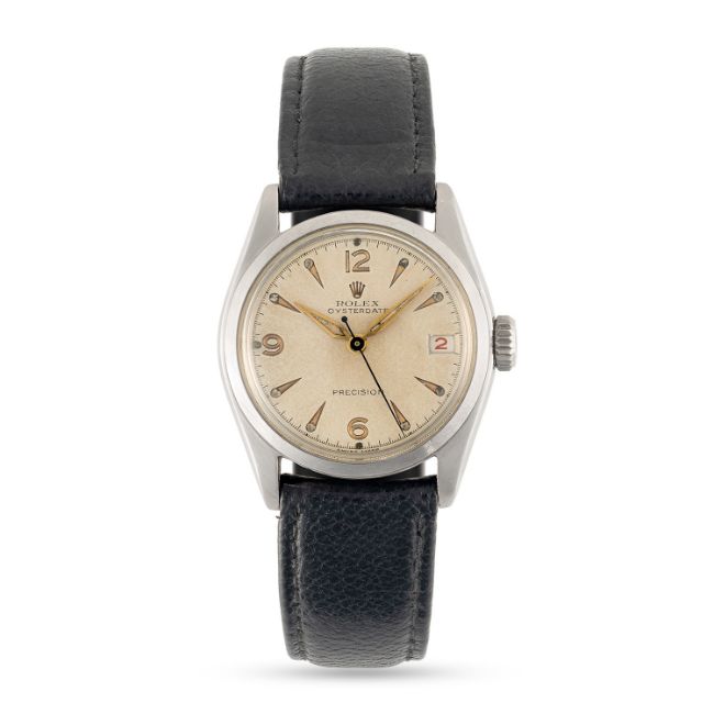 A MID SIZE STAINLESS STEEL ROLEX OYSTERDATE PRECISION WRIST WATCHCIRCA 1950, REF. 6066 WITH "ROULETTE" DATEMovement: 17J, manual wind, signed Rolex Geneva.Case: Diameter approx. 30mm, Oyster screw back case, signed Rolex, serial no. 692,xxx, Rolex Super Oyster crown.Strap: Leather strap with Rolex pin buckle.  CONDITION REPORTDial: Original dial in very good condition, showing some small signs of age & patina. Movement: Running & functioning at present, timekeeping and accuracy cannot be guaranteed. Case: In excellent condition, with some small scratches due to general use. Strap/Bracelet: In fair condition.