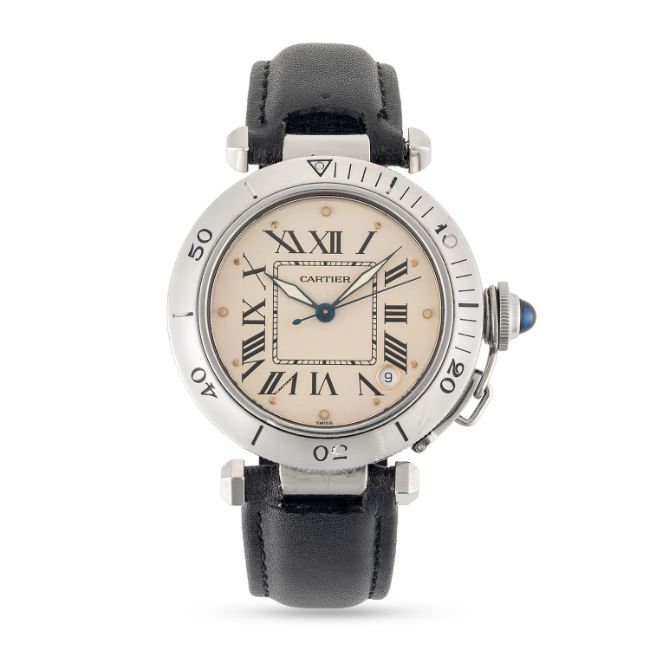 A GENTLEMAN'S SIZE STAINLESS STEEL CARTIER PASHA AUTOMATIC DATE WRIST WATCHCIRCA 1995, REF. 1030 1Movement: Automatic, signed Cartier.Case: Diameter approx. 36mm, signed Pasha de Cartier, numbered, original sapphire crown guard. Strap: Generic leather strap with Cartier deployment clasp.  CONDITION REPORTDial: Original dial in very good condition, showing some small signs of age. Movement: Running & functioning at present, timekeeping and accuracy cannot be guaranteed. Case: In good condition, with some small scratches and wear due to general use. Strap/Bracelet: In fair condition.