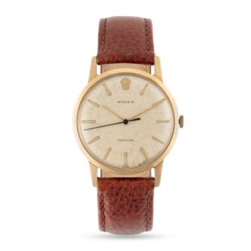 A GENTLEMAN'S SIZE 9CT SOLID GOLD ROLEX PRECISION WRIST WATCHCIRCA 1965 Movement: 17J, manual wind, signed Montres Rolex S.A., numbered. Case: Diameter approx. 33.5mm, signed Rolex Made in England A.L.D., 9ct Birmingham hallmarks, numbered. Strap: Leather.   CONDITION REPORTDial: Original dial in fair condition, showing signs of age. Movement: Running & functioning at present, timekeeping and accuracy cannot be guaranteed. Case: In very good condition, with light scratches due to general use. Strap/Bracelet: In good condition.