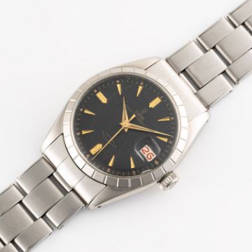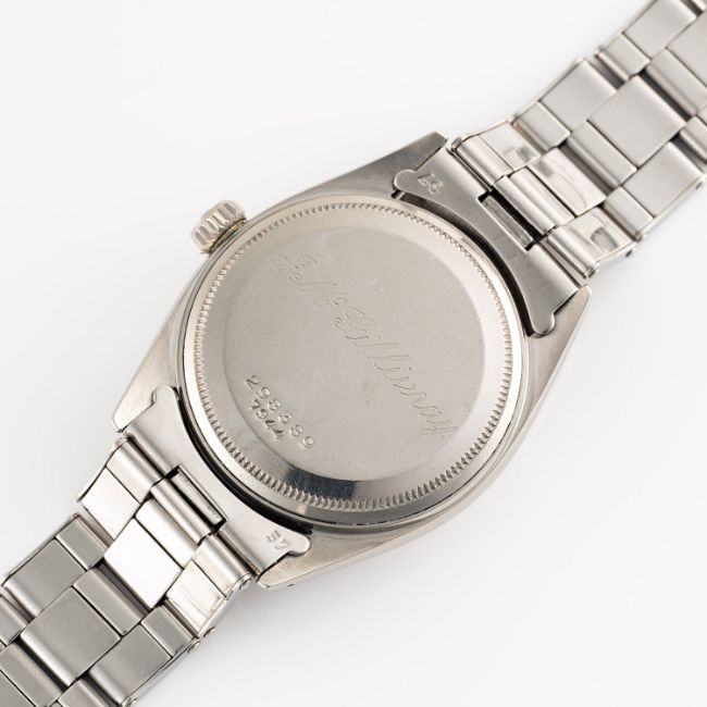 A RARE GENTLEMAN'S SIZE STAINLESS STEEL TUDOR PRINCE OYSTERDATE 34 BRACELET WATCHDATED 1959, REF. 7944 WITH GLOSS BLACK "HONEYCOMB" DIAL & "ROULETTE" DATE, ACCOMPANIED BY ITS ORIGINAL BOX & GUARANTEE PAPERWORK Movement: 17J, automatic with "Butterfly" rotor, signed Tudor Auto-Prince.Case: Diameter approx. 34mm, Oyster case, faceted bezel, signed Montres Tudor S.A., dated I.59, serial number 29x,xxx, name inscription on caseback, Rolex crown.Bracelet: Original Rolex Brevete "Large Logo" Oyster rivet bracelet, dated 2/59, with 57 end links. CONDITION REPORTDial: Original dial in excellent condition, showing some small signs of age. Movement: Running & functioning at present, timekeeping and accuracy cannot be guaranteed. Case: In excellent condition, with some small scratches due to general use. Strap/Bracelet: In very good condition, with light scratches & some wear.