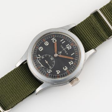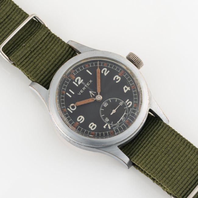 A GENTLEMAN'S BRITISH MILITARY VERTEX W.W.W. WRIST WATCH CIRCA 1945, PART OF THE "DIRTY DOZEN" Movement: 15J, manual wind, cal. 59, signed Vertex.Case: Diameter approx. 36mm, fixed bars, nickel plated top with steel screw back, issue markings W.W.W. ^ A 13628 3526544, lug numbered 623.Strap: NATO.  CONDITION REPORTDial: Original dial in excellent condition, showing some small signs of age. Movement: Running & functioning at present, timekeeping and accuracy cannot be guaranteed. Case: In excellent condition, with some light scratches & wear due to general use. Strap/Bracelet: In excellent condition.