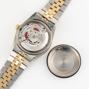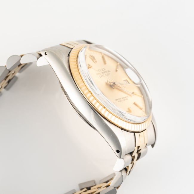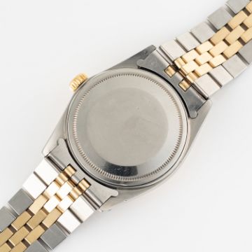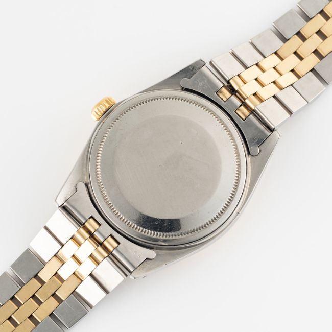 A GENTLEMAN'S SIZE STEEL & GOLD ROLEX OYSTER PERPETUAL DATEJUST BRACELET WATCHCIRCA 1982, REF. 16013 WITH CHAMPAGNE DIALMovement: 27J, automatic chronometer, cal. 3035, signed Montres Rolex S.A., numbered.Case: Diameter approx. 36mm, Oyster case, signed Montres Rolex S.A., serial no. 7,3xx,xxx, solid gold fluted bezel, Rolex crown.Bracelet: Rolex Jubilee steel & 18k solid gold bracelet, numbered N11/62523H.18/455.  CONDITION REPORTDial: Original dial in excellent condition. Movement: Running & functioning at present, timekeeping and accuracy cannot be guaranteed. Case: In good condition, with some scratches and light wear due to general use. Strap/Bracelet: In fair condition with light scratches and wear due to general use.