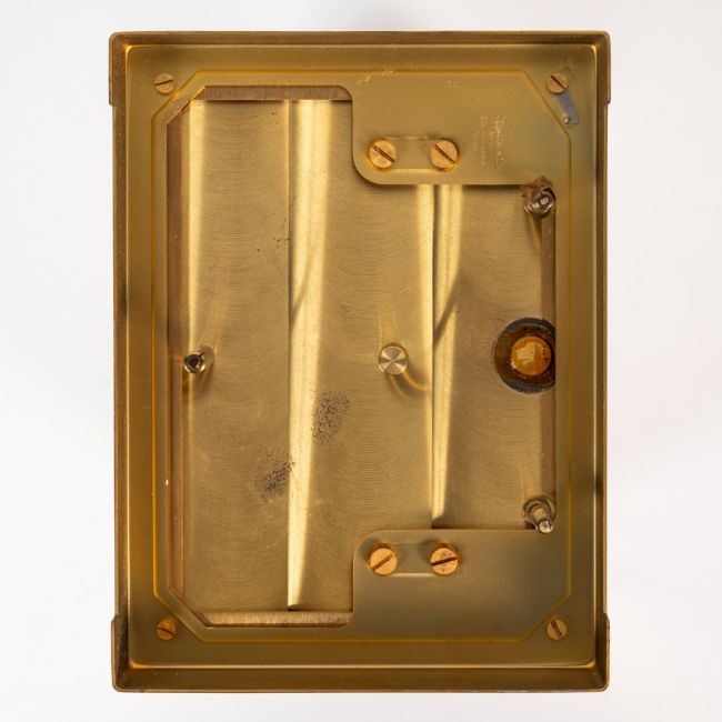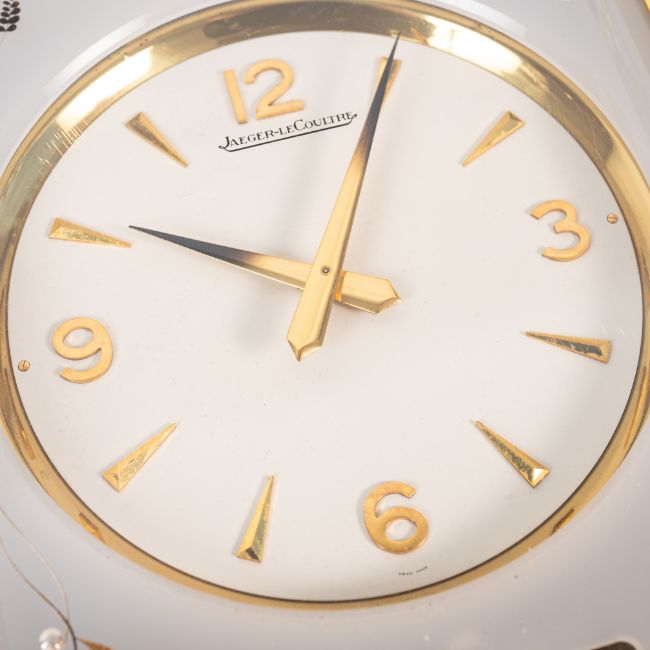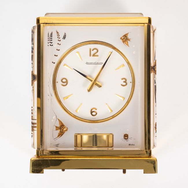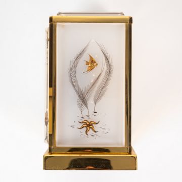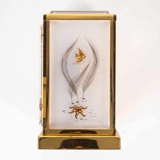 A RARE JAEGER LECOULTRE MARINA ATMOS DESK CLOCK CIRCA 1960s, WITH LUCITE PANELS DEPICTING MARINE LIFE & ACCOMPANIED BY ITS ORIGINAL FITTED TRAVEL CASEMovement: Cal. 526-5, Signed LeCoultre & Cie.Case: Measures approx. 22cm by 17.6cm by 13.3cm, signed LeCoultre & Cie.  CONDITION REPORTDial: Original dial in excellent condition. Movement: Running & functioning at present, timekeeping and accuracy cannot be guaranteed. Case: In good condition, with some wear due to general use. Travel box: In very good condition.