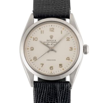 A GENTLEMAN'S SIZE STAINLESS STEEL ROLEX OYSTER PERPETUAL AIR KING PRECISION WRIST WATCHCIRCA 1966, REF. 5500 WITH ARABIC NUMERAL DIAL  Movement: 26J, automatic, cal. 1520, signed Rolex Geneva. Case: Diameter approx. 34mm, Oyster case, signed Montres Rolex S.A., dated I.66, serial no. 1,3xx,xxx, Rolex crown. Strap: Leather.  CONDITION REPORTDial: Original dial in excellent condition, showing small signs of age. Movement: Running & functioning at present, timekeeping and accuracy cannot be guaranteed. Case: In good condition, with small scratches due to general use. Strap/Bracelet: In excellent condition.