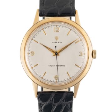 A GENTLEMAN'S LARGE SIZE 9CT SOLID GOLD ROLEX PRECISION WRIST WATCHCIRCA 1960s Movement: 15J, manual wind, cal. 710, signed Rolex, numbered. Case: Diameter approx. 36mm, snap back case, signed by Dennison Made For Rolex, hallmarked, numbered. Strap: Leather.   CONDITION REPORTDial: Refinished dial in very good condition. Movement: Running & functioning at present, timekeeping and accuracy cannot be guaranteed. Case: In excellent condition, with some light scratches due to general use. Strap/Bracelet: In excellent condition.