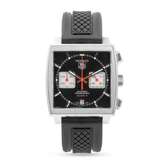 A GENTLEMAN'S SIZE STAINLESS STEEL TAG HEUER MONACO CALIBRE 12 AUTOMATIC CHRONOGRAPH WRIST WATCHCIRCA 2012, REF. CAW2114Movement: Automatic, cal. 12, signed TAG Heuer.Case: Width approx. 38.5mm, exhibition back, signed Monaco, numbered, TAG Heuer crown & pushers.Strap: Original TAG Heuer rubber strap & deployment clasp. CONDITION REPORTDial: Original dial in excellent condition.Movement: Running & functioning at present, timekeeping and accuracy cannot be guaranteed.Case: In excellent condition, with some small scratches due to general use.Strap/Bracelet: In excellent condition, with light scratches.