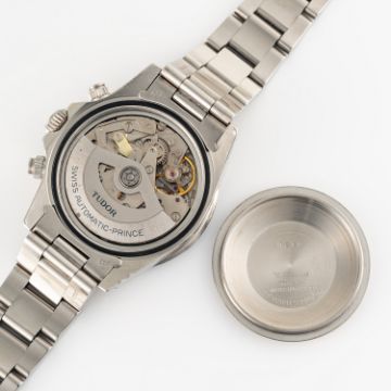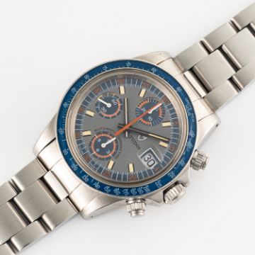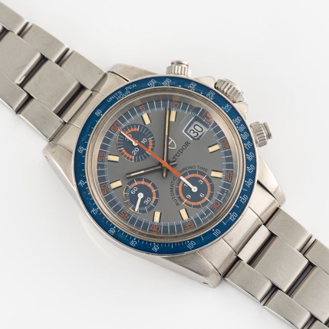 A RARE GENTLEMAN'S SIZE STAINLESS STEEL ROLEX TUDOR OYSTERDATE MONTE CARLO BLUE AUTOMATIC CHRONO TIME "BIG BLOCK" CHRONOGRAPH BRACELET WATCHCIRCA 1978, REF. 94200 3RD GENERATION "MONTE CARLO", WITH ORIGINAL TUDOR BOX, OPEN GUARANTEE PAPERWORK & SWING TAG Movement: 17J, automatic, cal. 7750, signed Tudor Automatic-Prince.Case: Diameter approx. 40mm, Oyster case, signed Montres Tudor S.A., case back ref. 9430, serial no. 88x,xxx, units per hour blue acrylic bezel, Rolex triplock crown & screw-down pushers.Bracelet: Rolex Oyster bracelet, numbered V8/78360/589.  CONDITION REPORTDial: Original dial in excellent condition, some slight ageing to the registers which are starting to turn "tropical". Movement: Running & functioning at present, timekeeping and accuracy cannot be guaranteed. Case: In good condition, with some scratches due to general use, some ageing to the bezel. Strap/Bracelet: In good condition with some scratches and wear due to general use.