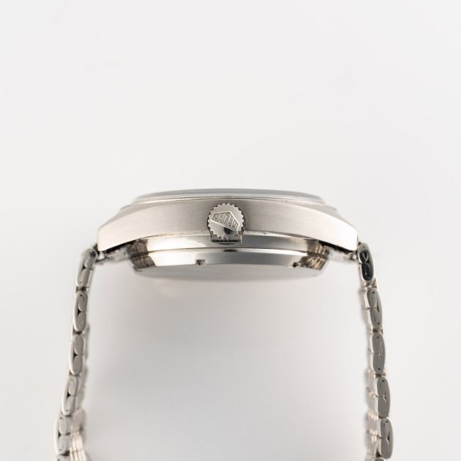 A GENTLEMAN'S SIZE STAINLESS STEEL HEUER CARRERA "JAGGER" AUTOMATIC CHRONOGRAPH BRACELET WATCH CIRCA 1974, REF. 1153N THIRD EXECUTION WITH BLUE-GREY DIALMovement: 17J, automatic, cal. 12, signed Heuer.Case: Width approx. 38mm, screw back, signed Heuer-Leonidas SA, serial no. 222,xxx, Heuer crown & pushers.Bracelet: Heuer GF "Beads of Rice" bracelet with flip lock clasp, dated 4/71. CONDITION REPORTDial: Original dial in excellent condition, showing some small signs of age.Movement: Running & functioning at present, timekeeping and accuracy cannot be guaranteed.Case: In excellent condition, with some light wear due to general use.Strap/Bracelet: In excellent condition, with light wear.